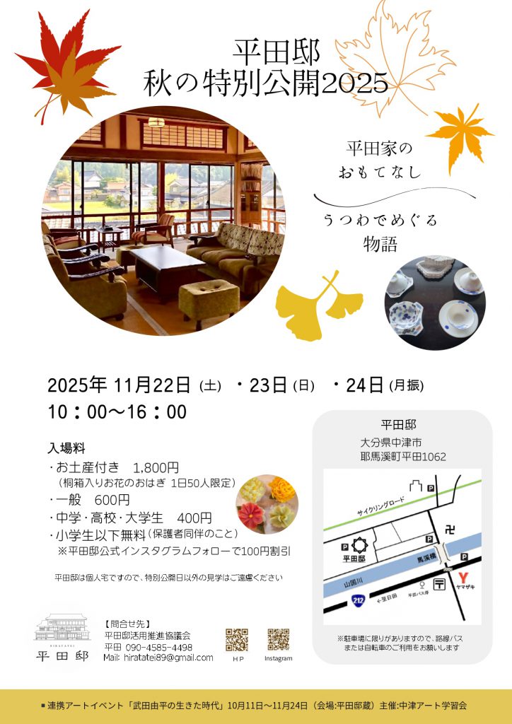 耶馬溪の紅葉とあわせて、文化財建造物とお屋敷を彩る書画、邸宅に伝わる色とりどりの器をお楽しみください。